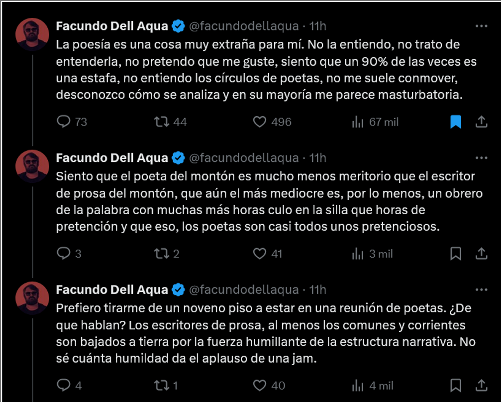 Para bien o para mal, lo que Octavio Paz denominó (con un hermoso oxímoron) la “tradición de la rutpura” con los años se volvió dominante, y por eso suele leerse esta transformación como un triunfo, uno de los mayores legados de las vanguardias. Sin embargo, es posible ensayar una mirada más crítica sobre la hegemonía versolibrista; quiero detenerme en una serie de tuits del escritor de terror Facundo Dell Aqua donde ataca la poesía en términos a la vez similares y diametralmente opuestos a Gombrowicz.